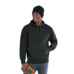 440 gsm - 13 oz./yd - 21.5 oz./lin. yd 50% cotton, 50% polyester heavyweight fleece with PFC-Free water repellent finish. Jersey lined hood with drawcord. Rib knit cuff and hem. Kangaroo pocket with triple needle topstitching and hidden pocket. Tear away label.